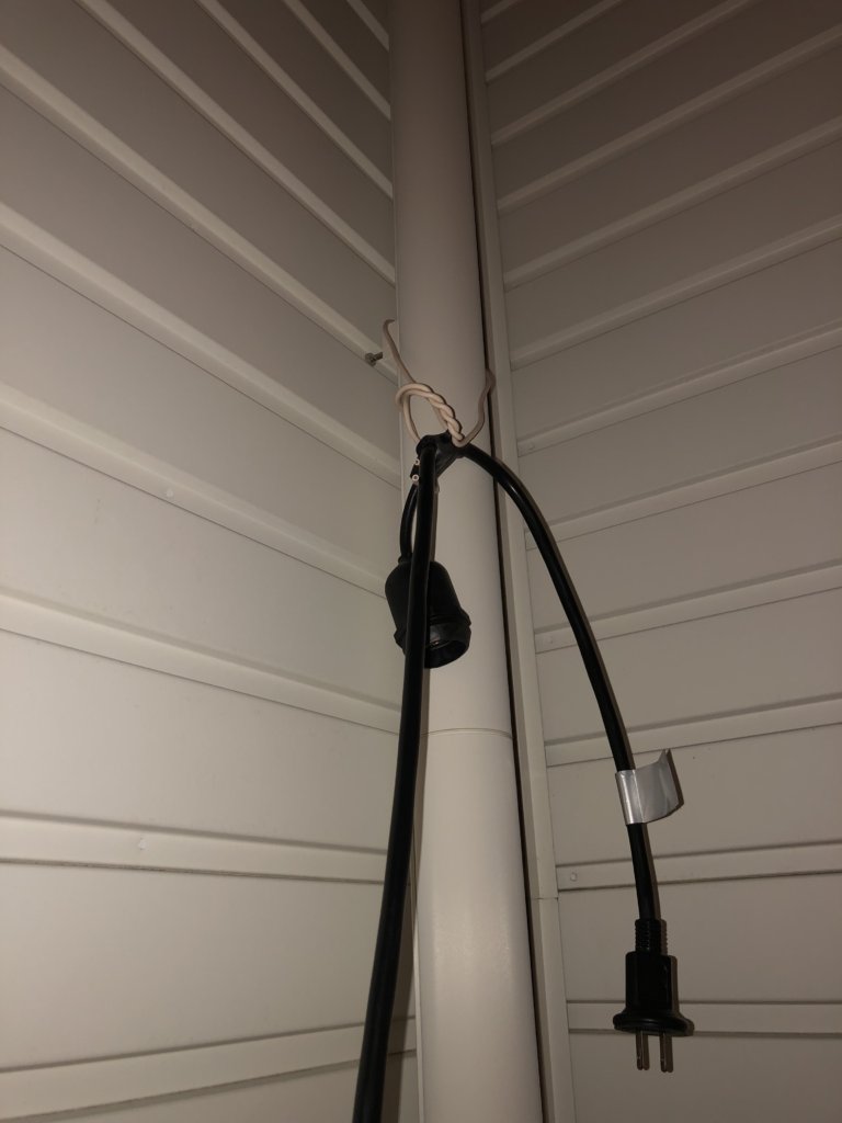 延長コードが立ち上がった上のこんな感じで雨どいに電線の切れっ端をネジネジして付けてるだけです。笑